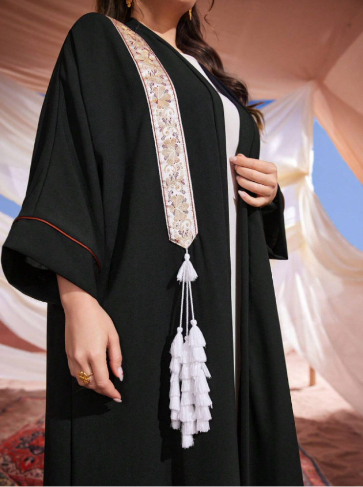 عباية بحزام أنيقة بتصميم فاخر مزين بالترتر يضفي لمسة من التألق والرقي. ثوب فضفاض طويل يصل إلى الأرض، مثالي للسهرات والمناسبات الإسلامية، يجمع بين الأناقة والاحتشام مع راحة لا مثيل لها.